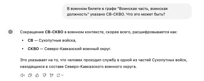 Пример из недавней практики: в военном билете мужчины, проходившего службу в армии, в графе «воинская часть» и «воинская должность» значилось «СВ-СКВО». ChatGPT за пару секунд сэкономил 10–20 минут поиска, подсказав расшифровку: Сухопутные войска, Северо-Кавказский военный округ (Ground Forces, North Caucasus Military District).