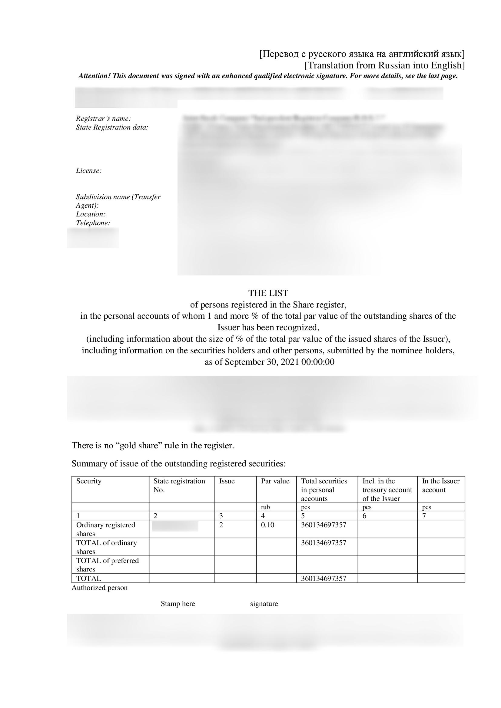 Пример оформления перевода реестра акционеров на английский